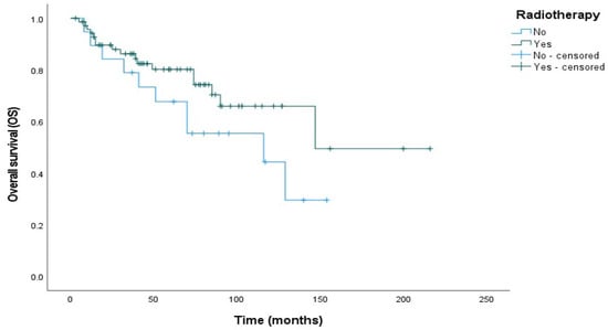 Figure 2 shows the OS of patients who had undergone RT in multimodal management. In those who were submitted to RT, an OS rate of 60% was observed versus 42% in those who did not receive RT (p: 0.14). Furthermore, more of those who received RT survived than those who did not receive RT; however, the rate was not statistically significant.