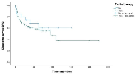 Figure 3 shows DFS rates considering RT performed, and in patients who received RT, a rate of 42% was observed in comparison with those who did not receive RT (34%) at 17 months after the conclusion of therapy. After performing the log-rank test, no statistical significance was shown (p: 0.44).