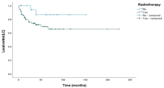 Figure 4 shows local control (LC) of the disease considering RT performed. In those who did and did not receive RT after 16 months of treatment, the LC rate was observed to be 50% in both groups. However, LC was nine times higher in patients that received RT than in those who did not receive RT, without statistical significance (p: 0.09)