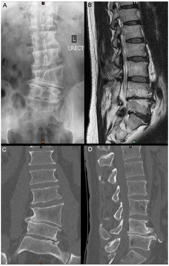 Imaging at presentation: (A) standing AP X-ray; (B) sagittal slice of T2 MRI of the lumbar spine; (C) lumbar spine CT coronal slice; (D) lumbar spine CT sagittal slice at a similar position to (B).