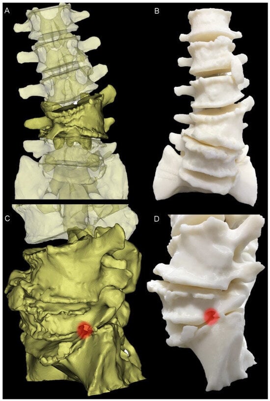 Three-Dimensional modelling. (A) Anterior view of the preoperative pathological anatomy; hemivertebra is opaque; remainder of the lumbar spine is translucent. (B) Anterior view of the 3D-printed haptic biomodel. (C) Left-hand side view of the virtual model, showing the neuroforaminal stenosis at the L5-S1 level (red highlight). (D) Similar to (C), with the red highlight showing the neuroforaminal stenosis in the 3D-printed biomodel.