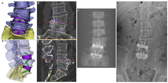 Virtual surgery planning (VSP). (A) Anterior view of the 3D model of the planned anatomical reconstruction and cage positions for medium-sized cages (NB: a small cage was actually used at the L4-5 level). (B) The 3D model shown in (A) superimposed on S1 in the preoperative CT (coronal slice shown). (C) Simulated X-ray of the 3D model in (A). (D) Postoperative standing X-ray. (E) Lateral view of the planned reconstruction with translucent vertebrae to show the screws and devices. (F) Sagittal-plane CT slice with the 3D reconstruction shown in (E) superimposed on S1 to show the planned postoperative state compared to the pathological state.