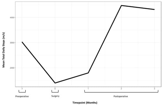 Perioperative mean total daily step count data demonstrating postoperative recovery and improvement over preoperative function. Note: Data were collected via smartphone-based wearable accelerometry (Apple Health application on the iPhone smartphone; Apple Inc., Cupertino, CA, USA).