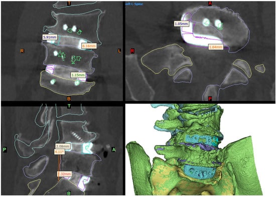 Day-1 postoperative CT and 3D reconstruction of the construct (bottom right panel) compared to the virtual surgery planned (VSP) device and anatomy positioning (shown by the coloured outlines). The L5-S1 device was positioned very close to the VSP position, being ~1–1.5 mm further to the right and anterior than planned. The L4-L5 device was implanted ~6 mm to the left and ~2 mm anterior to the VSP position (see Section 3), which resulted in slightly less coronal and a sagittal-plane angle adjustment of the L4 hemivertebra being achieved than planned.