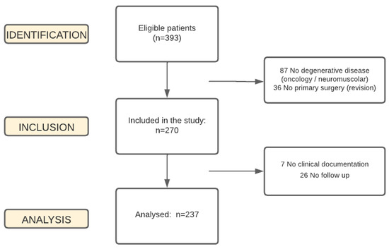 In total, 306 patients eligible for the study were identified. Of these, 7 could not be enrolled for data loss, 26 were lost to the study as they did not show up for their follow-up visits, and 36 were admitted for mechanical dysfunction and undergoing revision surgery for a previous failed surgery. The statistical analysis was, therefore, conducted on a total of 237 patients. Figure 1 shows the relevant flow chart.