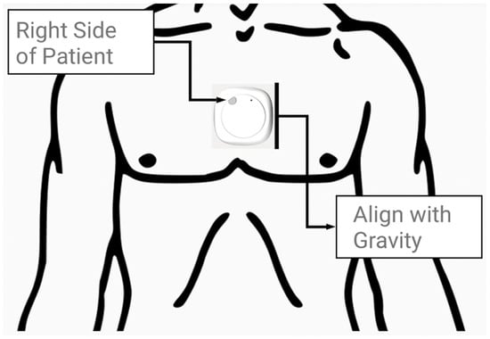 Prior to the walk, the inertial measurement unit, a MetaMotion© (MMC) manufactured by Mbientlab Inc. (San Francisco, CA, USA), was fitted on the skin immediately above the sternal angle of the participants, as shown in Figure 1. The device was aligned vertically with the line of gravity and secured firmly using medical tape. Following a short initial pause to orient the MMC device, the participants walked a self-selected distance (15–120 m) along an unobstructed hospital corridor pathway on level ground. Trials were discarded if the patient did not (or could not) pause to orient the device or required a walking aid during the walking bout. The MMC device’s position was confirmed before and after the procedure by an engineer and assistant on site. Further information on wearable devices and data processing can be found via Betteridge C. et al. (2021) and Natarajan et al. (2022) [10,21]. The MMC device was previously tested for accuracy and reliability in 22 healthy control patients by Betteridge C. et al. (2021) [21].