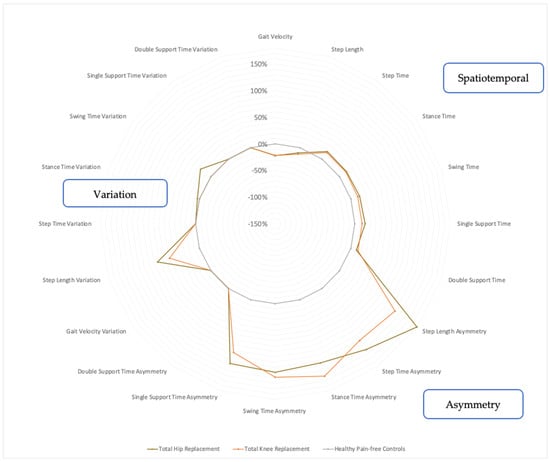 The TKR group also involved deteriorations in the spatial and temporal metrics of their gaits but to a lesser extent than the THR group. The TKR participants walked with a lower gait velocity (−21.5%, p < 0.001) and a shorter step length (−12.7%, p = 0.006), whilst the step time (+15.2%, p < 0.001), stance time (+14.8%, p < 0.001), swing time (+13.6%, p < 0.001), single support time (+13.9%, p < 0.001) and double support time (+13.8%, p < 0.001) increased, as shown in Figure 3 (and Appendix B Table A2). The TKR participants also demonstrated marked gait asymmetry, which involved step length asymmetry (+129%, p = 0.001), step time asymmetry (+121%, p = 0.003), stance time asymmetry (+151%, p = 0.002), swing time asymmetry (+138%, p = 0.006) and single support time asymmetry (+104%, p = 0.005). In terms of gait variability, the TKR group demonstrated only increased step length variability (+59.5%, p = 0.001), as seen in Figure 3.