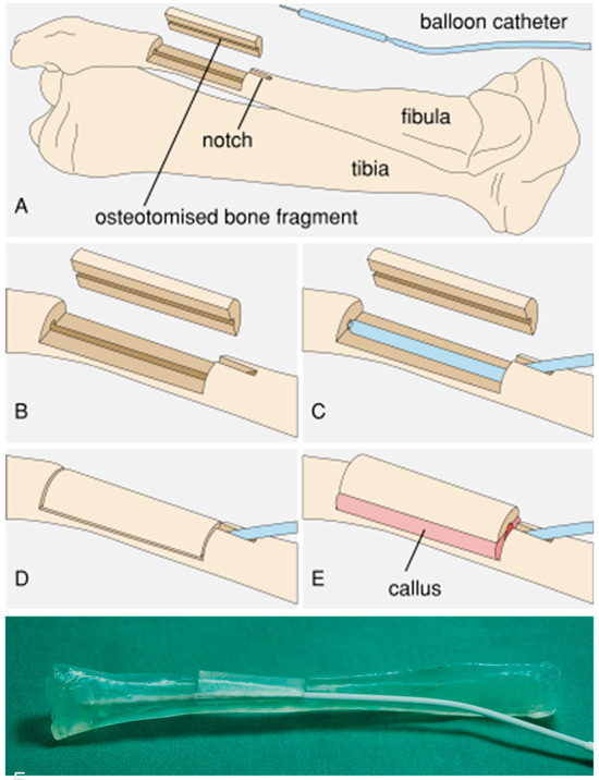 Principle of the fibula expansion procedure. (A) Overview. (B) A cortical cover is prepared from a segment of the fibula and a notch is cut in the fibula. (C) The balloon catheter is implanted. (D) The cortical cover is repositioned and the wound is closed. (E) After callus formation, expansion occurs due to continuous elevation of the cortical cover via expansion of the balloon. (F) Photograph of the test setup with a 3D-printed porcine fibula model.