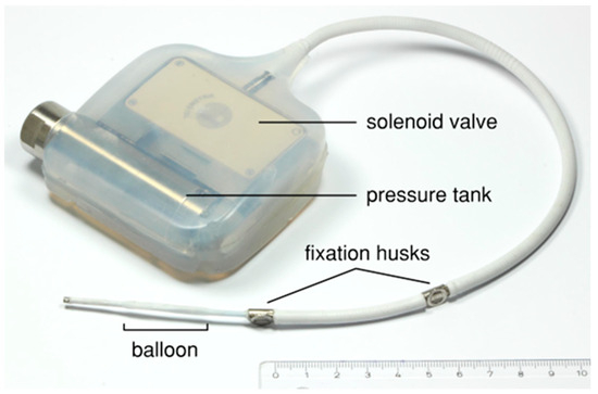 The main components of the implantable device (Figure 2) for the animal test are a liquid-filled pressure tank and a balloon catheter connected by a solenoid valve, which is controlled using a microcontroller. A commercially available balloon catheter for percutaneous transluminal angioplasty (Renma®; Terumo Corporation, Tokyo, Japan) was modified to make it suitable for the expansion of fibular bone. The balloon catheter was equipped with a titanium wire in the distal section and a high-grade steel coil around the proximal section in order to prevent breakage. A 0.25 mm thick silicone sheath (MED-4765; NuSil Technology LLC, Carpinteria, CA, USA) protects the balloon catheter against the sharp-edged bone tissue. In addition, an eyelet and two wing clamps are applied to enable the fixation and relieve strain at the distal end of the catheter. The balloon catheter has an initial diameter of about 2.4 mm and a maximum expansion diameter of 5 mm, which is adapted to the medullary cavity of the porcine fibula, with an average diameter of approximately 2 mm.