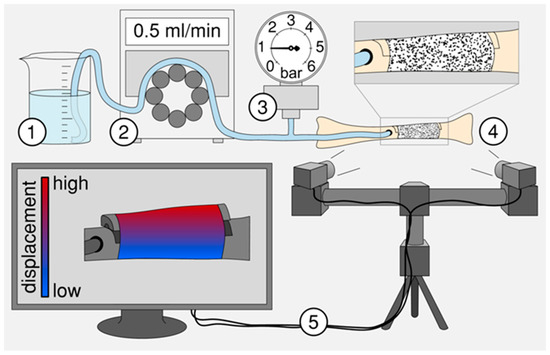 Schematic of the experimental test setup to examine the suitability of balloon catheters for subsequent animal testing. The experimental setup consists of (1) a fluid reservoir, (2) a peristaltic pump, (3) a pressure gauge [30], (4) a replicated and osteotomized fibula from a domestic pig and (5) an optical measuring system to detect the displacement or elongation of the artificial callus during stepwise balloon filling.