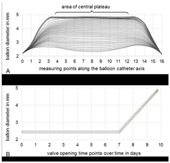 (A) Profile measurement of 16 equidistant measuring points distributed along the longitudinal balloon catheter axis. Interpolated curves are based on the measured data per equidistant valve opening. (B) Selection of appropriate valve opening time-points to ensure a linear increase in balloon diameter during expansion over three days, after seven days’ waiting time to enable neocallus formation.