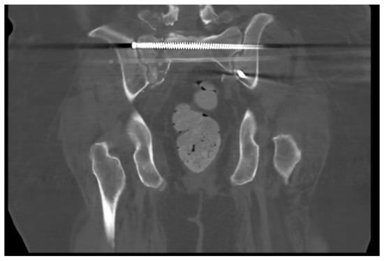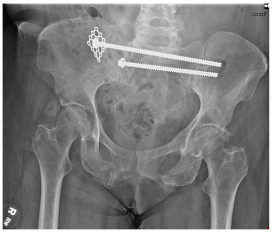 - Banerjee, R.; Brink, P.; Cimerman, M.; Pohlemann, T.; Tomazevic, M. Operative Treatment: Unilateral Complete Disruption of Posterior Arch through Sacrum [Internet]. Davos, Switzerland; The AO; 2015. Available online: https://surgeryreference.aofoundation.org/orthopedic-trauma/adult-trauma/pelvic-ring/unilateral-complete-disruption-posterior-arch-through-sacrum/operative-treatment#introduction (accessed on 18 December 2023).