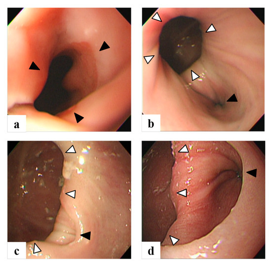 The changes in appearance of the diverticulum in EGD. (a) Mild esophageal dilatation with narrowing at the EGJ was observed three years ago (black arrowhead). However, there were no abnormal findings that indicated the occurrence of an epiphrenic diverticulum. (b) EGD one year ago revealed the occurrence of an epiphrenic diverticulum at the left wall of the lower esophagus (white arrowhead) with narrowing lumen at the EGJ (black arrowhead). (c) EGD five months before the operation revealed the enlargement of the diverticulum, and the true lumen of esophagus was narrowed due to the compression by the diverticulum (black arrowhead). (d) Two months before the operation, EGD revealed the further enlargement of the diverticulum (white arrowhead).