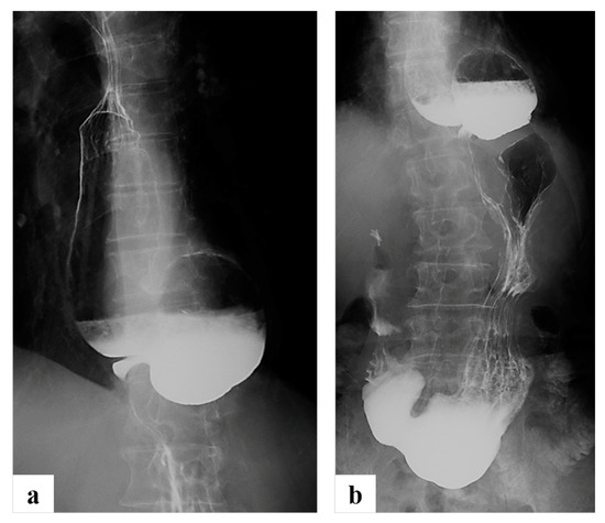 The findings of esophagography before operation. (a) L-shaped meandering of the esophagus and an epiphrenic diverticulum of 6.7 cm in diameter at the left wall of the lower esophagus were observed in esophagography. (b) The lumen of the esophagus was narrowed due to compression by the diverticulum at the EGJ.