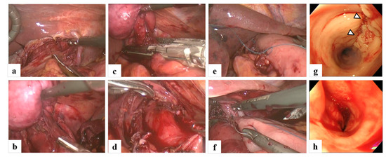 He was diagnosed with a combination of esophageal achalasia (advanced sigmoid type, Grade I) and an epiphrenic diverticulum, and a simultaneous laparoscopic surgery was performed. The surgery was performed in a lithotomy position, in which the surgeon assumed the French position. The intraoperative surgical views are shown in Figure 3. Five trocars were inserted into the abdominal cavity: (1) periumbilical 12 mm camera port, (2) 12 mm left hypochondrial right-hand working port, (3) 5 mm right hypochondrial left-hand working port, (4) 5 mm left anterior axillary retraction port and (5) 5 mm subxiphoid liver retractor port. The round ligament of the liver was fixed to the abdominal wall with a piercing ligation using a 3-0 prolene needle suture, in order to keep the operative field broad. The liver branch of the vagal nerve was preserved. After exposure of the abdominal esophagus, the diaphragm was cut at the anterior part of esophageal hiatus (Figure 3a), and the diverticular wall was separated from the surrounding organs using a combination of sharp and blunt dissection (Figure 3b). A Penrose drain was passed behind the abdominal esophagus in order to prevent direct grasping of the stomach and esophagus, and to pull the stomach into the abdominal cavity for retraction, thereby avoiding injury to both the stomach and esophagus. The diverticular wall was then properly excised using two linear staplers, taking care to avoid esophageal wall injury (Figure 3c). The most critical part is pinching the diverticular wall using a suture device horizontally along the esophagus and cutting it with several suture devices in a planned manner. After the resection of the diverticulum, a craniocaudal incision was made in the esophageal muscle layer around the suture line after diverticulectomy (Figure 3d), and both the incisional line of the muscle layer and the suture line were wrapped by the fornix of the stomach (Figure 3e,f). After the resection of the diverticulum, the absence of anastomotic leakage or intraluminal stenosis was confirmed via endoscopic intraluminal observation (Figure 3g). Heller’s myotomy and Dor’s fundoplication were then performed to recreate the antireflux valve. Intraoperative EGD after Dor’s fundoplication revealed the enlargement of the EGJ and the easiness of the scope passage (Figure 3h). The surgery lasted 276 min, and the intraoperative blood loss was 50 g.