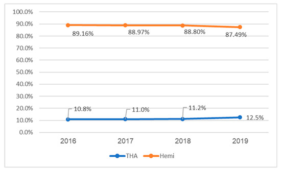 A recent study based on the NIS database also found a statistically significant increase in the percentage of femoral neck fractures treated with THA in the United States between 2005 and 2014, with a constant inclination with the THA percentage from 8.3% in 2005 rising to 13.7% in 2014 [10]. Our study showed a similar trend, with a constant inclination in the THA percentage from 10.8% in 2016 to 12.5% in 2019. The lower trend in the latest study could arise from the difference in the coding system, changing from ICD 9 in the recent research to ICD 10 in our study.