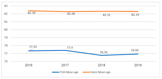 Age in years of hemiarthroplasty and total hip arthroplasty patients between 2016 and 2019.