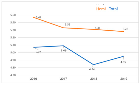 Figure 3 portrays the average hospital stay post-total hip arthroplasty (THA) or hemiarthroplasty from 2016 to 2019. THA patients’ stays ranged from 5.07 days in 2016 to 4.95 days in 2019. In contrast, hemiarthroplasty patients began at 5.47 days in 2016 and decreased to 5.28 days by 2019. Hemiarthroplasty consistently resulted in more extended stays than THA throughout the study period. Additionally, both surgeries exhibited a statistically significant trend toward reduced hospitalization over time.