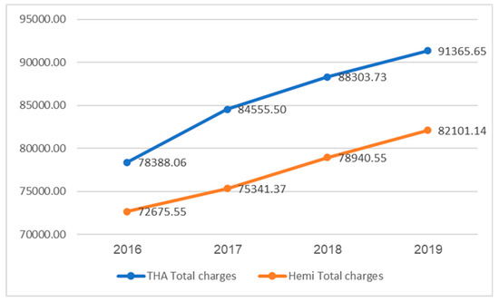 From 2016 to 2019, it seems that the recommended surgical approach changed. THA for femoral neck fractures was gradually preferred over HA, although HA was still much more popular. Although the mean LOS among HA patients was slightly higher than THA, the mean charges for HA were much lower than THA, and while both treatments became more expensive, THA became more expensive. For example, the HA price rose in 3 years from USD 72,675 to USD 82,101, representing an elevation of 12.9%, and the THA price rose from USD 78,388 to USD 91,365, representing a rise of 16.5%.