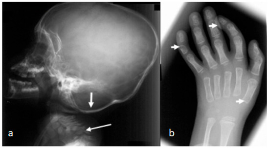 - De Smet, L.; Legius, E.; Fabry, G.; Fryns, J.P. The Larsen syndrome. The diagnostic contribution of the analysis of the metacarpophalangeal pattern profile. Genet. Couns. 1993, 4, 157–164. [Google Scholar]