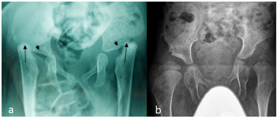 (a,b): AP pelvis radiograph of a 7-month-old girl with Larsen syndrome showing bilateral hip dislocation associated with maldevelopment of severely dysplastic acetabulum and dysplastic capital femoral epiphysis (arrows) (a). AP pelvis radiograph of a 3-year-old boy with Larsen syndrome showing bilateral hip dislocations (severe acetabulo-femoral dysplasia) (b).
