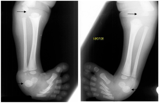 AP knees radiograph of a 5-month-old boy with Larsen syndrome showing bilateral knee dislocations (arrows) associated with under tubulation of the tibae and fibulae. Note the fragmented/deformed epiphyses and that the right tibia is medially subluxated. Note bilateral talipes equinivarus associated with double ossifications of the calcaneus (arrows).
