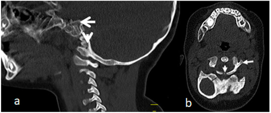 (a,b). A 3D-reformatted sagittal CT scan of the cranium in a six-month-old child with Larsen syndrome who was born with congenital tetraplagia. Note the maldevelopment of the anterior ring of the atlas C1, which has been displaced along the superior surface of the clivus. Also, the odontoid process is hypoplastic and dislocated and displaced between the defectively developed anterior rings (arrow head). Fusion of the fragmented anterior and posterior rings of C1 and fusion of these fragments causing effectively the development of a Y-shaped deformity (a). Axial 3D-reformatted CT scan showing congenital maldevelopment of the anterior arch of the atlas and fusion of the remnants of the anterior ring with the lateral mass of C1 (forming a Y-shaped bone deformity) (arrow head). The posterior ring of C1 is hypoplastic resembling a Jefferson fracture (arrow head) (b).