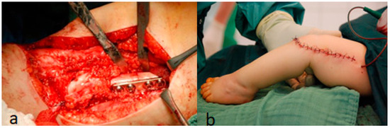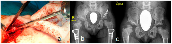 Congenital multiple dislocations often prove a difficult task for pediatric orthopedic surgeons. Skeletal deformities in Larsen syndrome can recur. The dislocated hip joints must be treated as early as possible. Since at the same time, there is often hyperlaxity of the knee joints with anterior dislocation of the tibia, conservative treatment with physiotherapy and a Pavlik harness must primarily be carried out. While it is usually possible to reduce the knee joints through slow repression, the hip joints have to be openly reduced, which is technically difficult because they are due to the Larsen syndrome’s extremely unstable joints. In order to achieve sufficient joint stability, the open reduction must be combined with a bony procedure in which the dysplastic acetabulum is corrected. The surgical method according to Pemberton/Dega has proven successful in our hands, in which a slightly curved chisel is inserted in the cranial area to the edge of the acetabulum, the ileum is severed to just above the Y joint, and a triangular bone graft inserted into the osteotomy gap is fixed with a K wire. Depending on the existing anatomical conditions, an intertrochanteric osteotomy may also be indicated—for example, in the case of increased ante torsion of the femoral neck—in order to achieve optimal centering and stability of the femoral head in the joint socket. Because of the bony procedures, the surgery is not indicated before the age of 12 months. We performed it simultaneously combined proximal femoral varus osteotomy, and shelf acetabuloplasty has been performed in a 14-month-old girl with Larsen syndrome. The aim of these surgical procedures is to assure good containment of the bilateral hip dislocation. A double incision was used for this type of surgery (Figure 6a). Proximal femoral osteotomy for varization and de-rotation was performed at the intertrochanteric level (Figure 6b). In the postoperative period, neck-shaft angles were never reduced to less than 110°, and the de-rotation angle was less than 20° (Figure 6c).