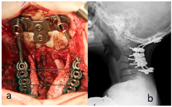 (a,b). As shown in the photo (intraoperative), at the end of the surgery 10, 3, and 5 mm screws were inserted in the lateral masses of C3-6 and intralaminar in C7 as well as two standard screws that were applied to the occipital plate (Figure 7a). A lateral cervical spine radiograph, ten years after surgery, showed good bone fusion, and the hardware is still stable (b). Follow up after10 years (2014–2024) showed no neurological deficits. The foot surgery (talipes equinovarus) was made in another hospital. The implants are stable and have good glance, so we decided not to do anterior decompression and fixation.