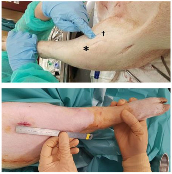 Surgical approaches to the knee. (Top): Domestic pig superolateral, anteromedial (*), and medial (†) approach. Lesion creation via medial approach. (Bottom): Göttingen mini-pig superolateral approach.
