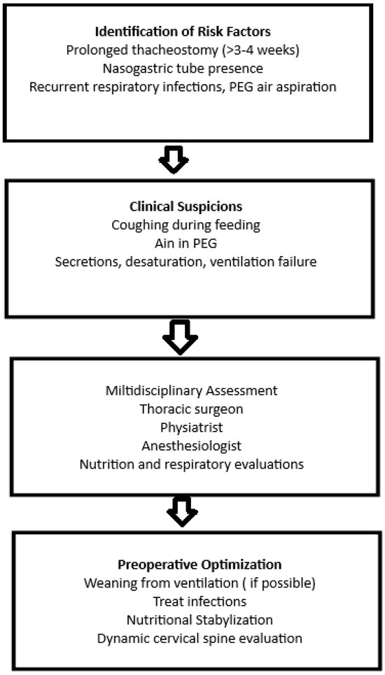6], the multidisciplinary approach may in fact be the "key factor" in preventing recurrences and improving postoperative outcomes. Collaboration among physiatrists, pulmonologists, endoscopists, radiologists, and surgeons enables early diagnosis, accurate staging, and appropriate patient selection for definitive intervention. In this sense, our neurorehabilitation experience shows that early identification of at-risk patients—based on sentinel symptoms such as the presence of air in the PEG bag, recurrent respiratory infections, or aspiration—should rapidly activate a shared diagnostic pathway involving a physiatrist, thoracic surgeon, and anesthesiologist.