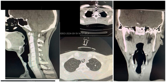 Another crucial aspect in evaluating surgical eligibility is the precise timing of the procedure. Inappropriate timing—such as in the presence of clinical instability or active respiratory infections—could severely compromise the surgical outcome. Equally fundamental are the diagnostic–functional assessments requested by the thoracic team. For surgical planning, the thoracic team required a series of targeted investigations to define both the fistula’s anatomical features and the patient’s overall condition. These included a computed tomography (CT) scan of the neck and chest (