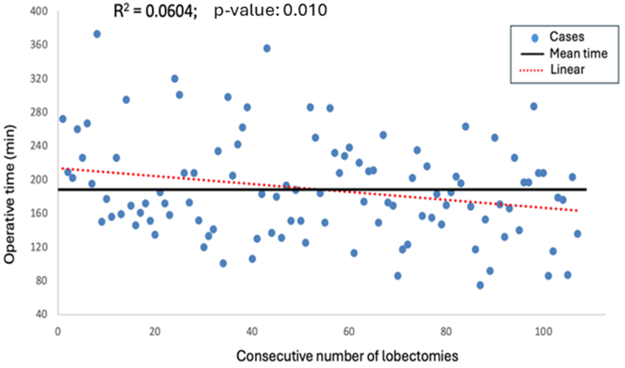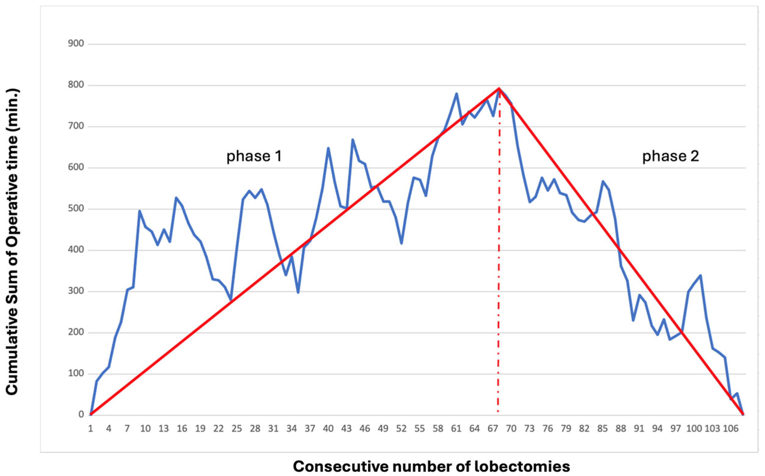 - As U-VATS lobectomy becomes globally prevalent, it suggests a period of skill acquisition for thoracic surgeons. CUSUM analysis of learning curve identified 67 uniportal VATS lobectomies as the inflection point for proficiency, with significant reductions in operative time (200 vs. 168 min, p = 0.006), conversions (15% vs. 2.5%, p = 0.04), and complications (42% vs. 22%, p = 0.04).