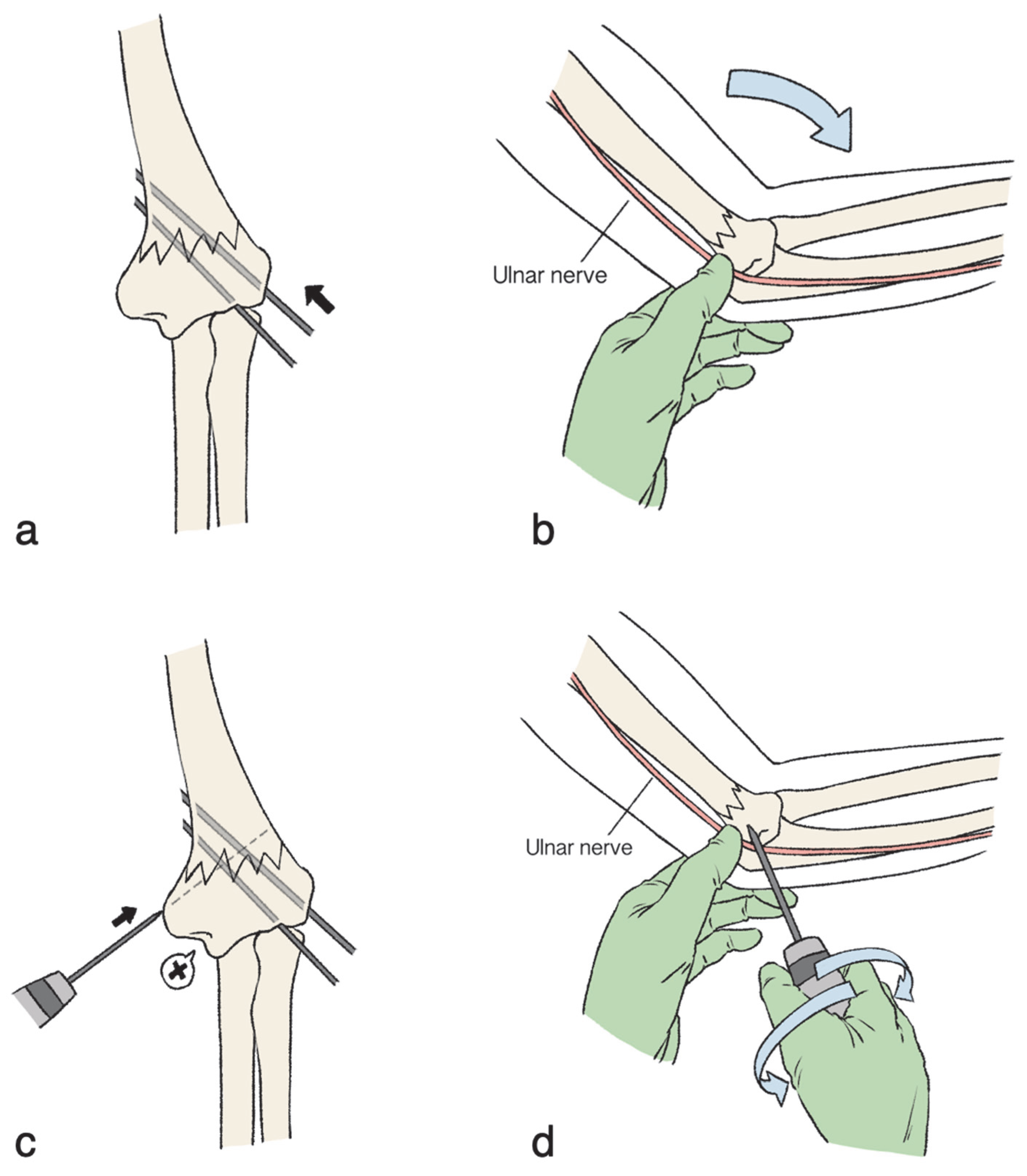 Several closed methods have been proposed in the literature. Elbow extension relaxes the ulnar nerve and decreases the risk of entrapment over the medial epicondyle. Previous studies have examined elbow position during medial pin insertion [