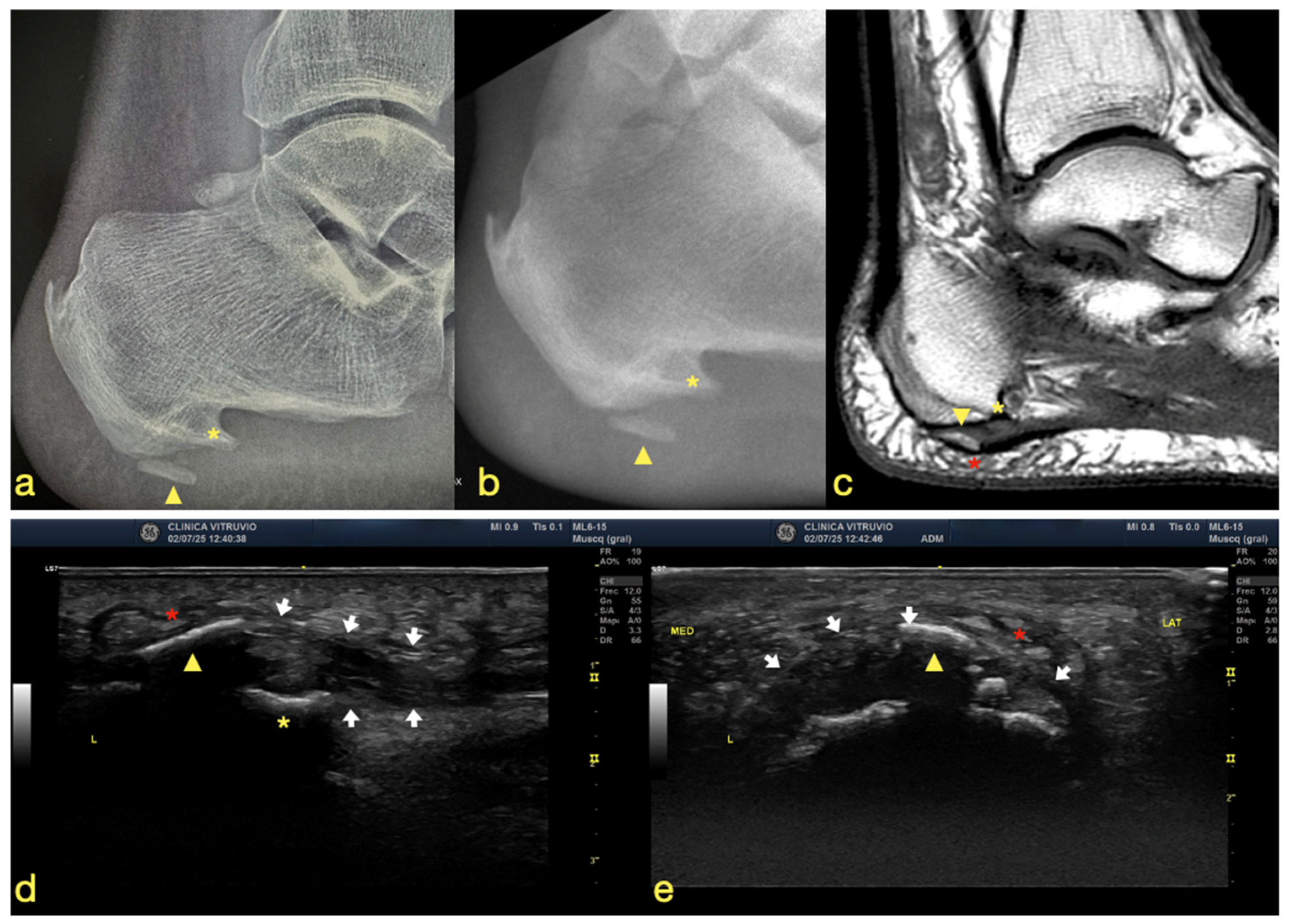 Figure 1). The diagnosis of heterotopic ossification was established upon identifying a bone formation with visible trabeculae within the substance of the plantar fascia and a clear separation from the bony insertion, allowing differentiation from a calcaneal spur or enthesophyte.