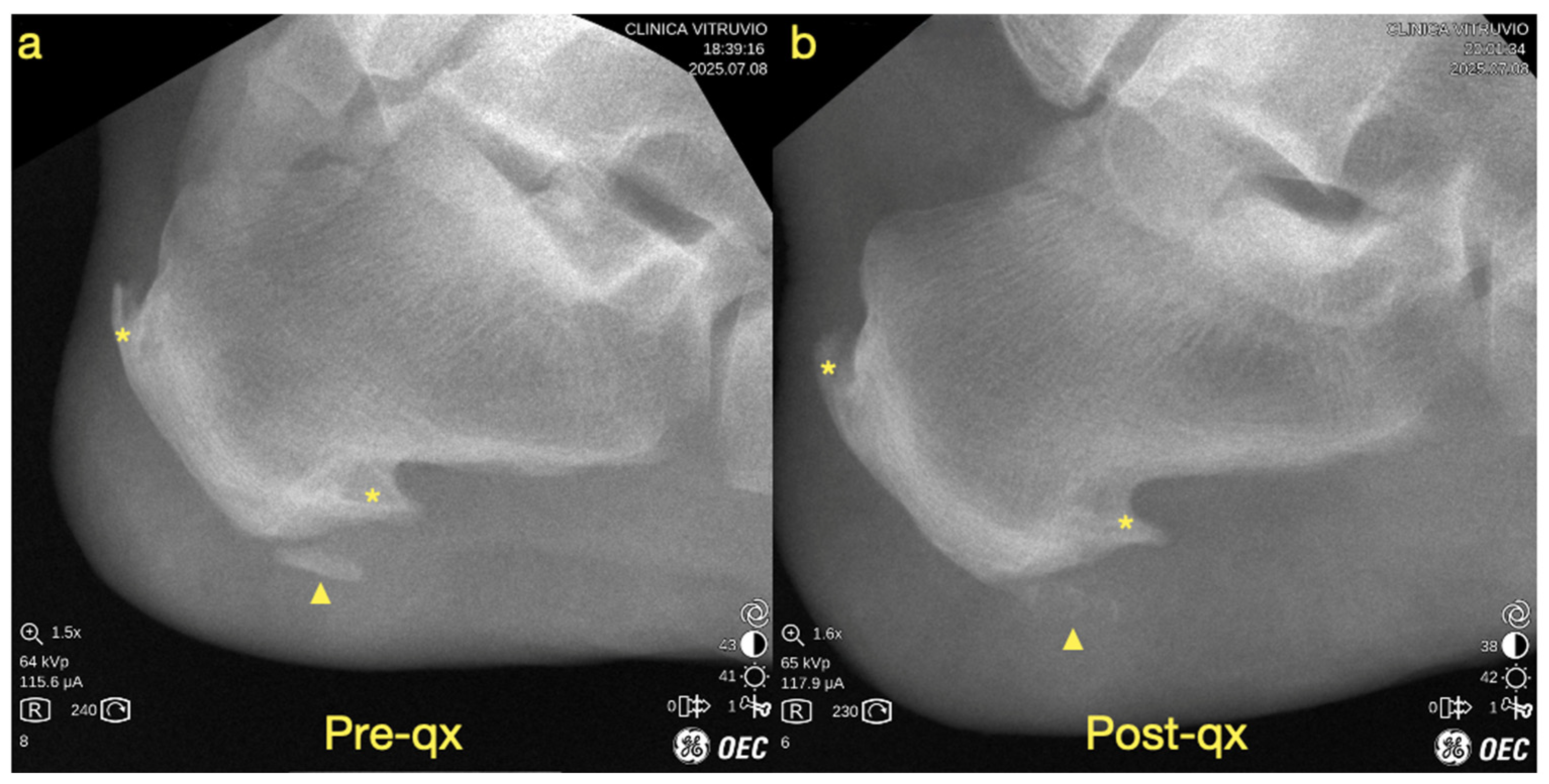 Postoperatively, the patient was instructed to wear a postoperative shoe for the first 3 weeks and to follow a protocol of relative rest, progressively increasing weight-bearing and activity according to pain tolerance. Oral NSAIDs were prescribed for 5 days after the intervention.