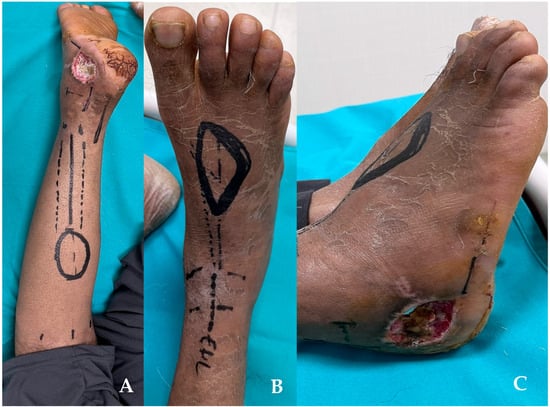 Preoperative view. (A) planning for reverse sural flap. (B,C) planning for the dorsalis pedis flap. In the last picture, the defect can be observed.