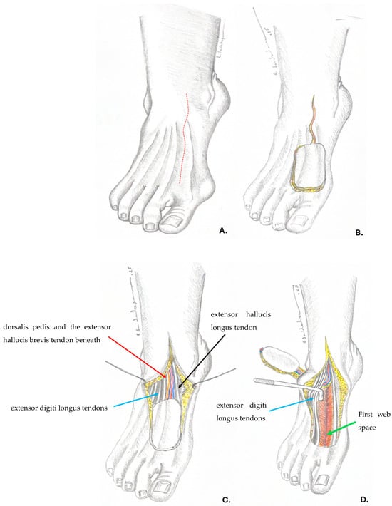 (A) preoperative planning, the anatomical position of the dorsalis pedis artery (red dotted line). (B) flap design and incision, prolonging the incision above the pedicle for further dissection. (C) the dissected flap; red arrow—dorsalis pedis and the extensor hallucis brevis tendon beneath; blue arrow—extensor digiti longus tendons; black arrow—extensor hallucis longus tendon. (D) creating the tunnel and moving the flap to the defect under the extensor digiti longus tendons (blue arrow); green arrow—first web space.—Drawings by Dr. Vaidahazan R. (personal collection).