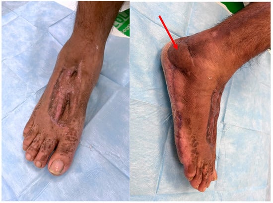 - Sakarya, A.H.; Tsai, K.-Y.; Hsu, C.-C.; Chen, S.-H.; Do, N.K.; Anggelia, M.R.; Lin, C.-H.; Lin, C.-H. Free tissue transfers for reconstruction of weight-bearing heel defects: Flap selection, ulceration management, and contour revisions. J. Plast. Reconstr. Aesthetic Surg. 2022, 75, 1557–1566. [Google Scholar] [CrossRef]