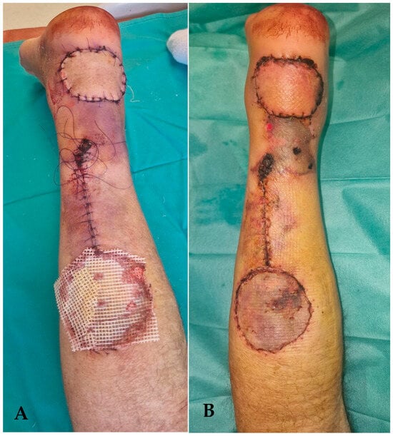 - Stepniewski, A.; Bingoel, A.S.; Jäckle, K.; Lehmann, W.; Felmerer, G. Two propeller flaps in a distal lower leg with bilateral defects as a single-stage procedure: A case report. JPRAS Open 2025, 44, 212–216. [Google Scholar] [CrossRef]