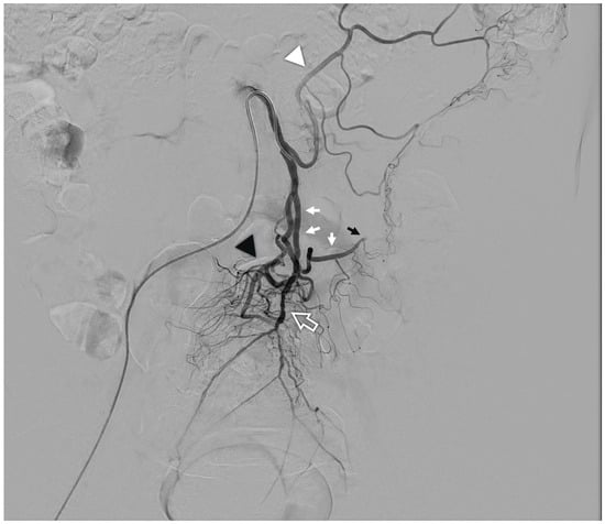 - Vidmar, J.; Omejc, M.; Dežman, R.; Popovič, P. Thrombosis of pancreatic arteriovenous malformation induced by diagnostic angiography: Case report. BMC Gastroenterol. 2016, 16, 68. [Google Scholar] [CrossRef]