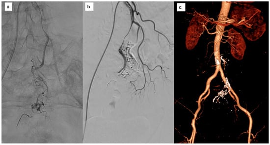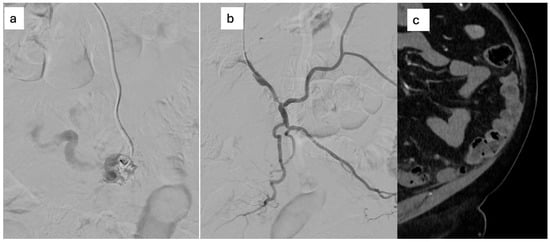 - Yamamoto, M.; Wada, T.; Kondo, H. Successful Treatment of Inferior Mesenteric Arteriovenous Malformation Using Direct Mesenteric Venous Puncture Embolization Combined with Transarterial Embolization. Cardiovasc. Interv. Radiol. 2025, 48, 410–412. [Google Scholar] [CrossRef]
