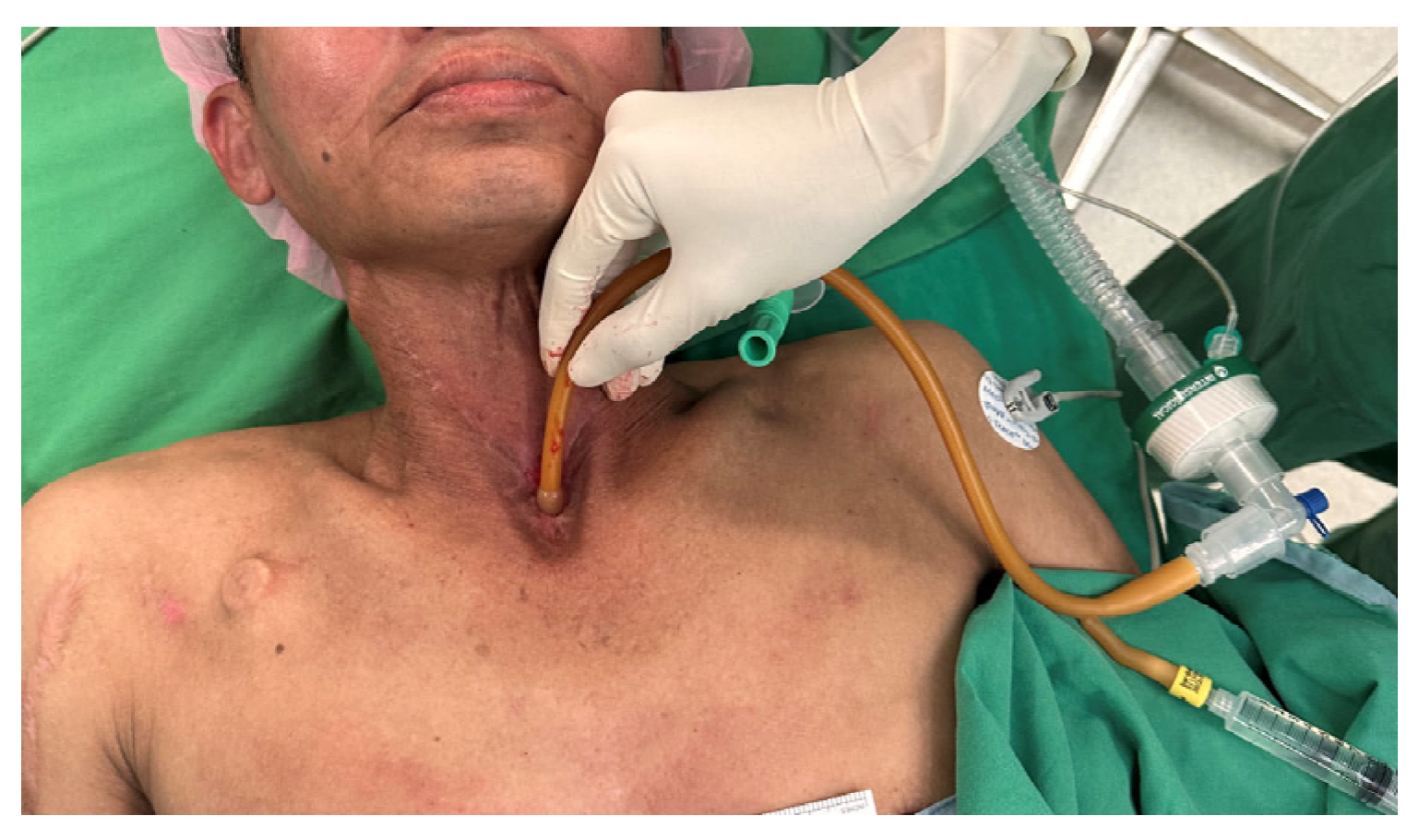 Approximately six weeks postoperatively, the patient developed progressive dyspnea due to stomal stenosis. Several interventions were performed, including stoma debridement and stomaplasty with radial incisions; however, restenosis recurred. Subsequently, serial dilatations were attempted in the outpatient clinic using a Foley catheter, but only minimal and temporary improvement was achieved, as the procedure could be tolerated for only a short duration under local anesthesia. Due to persistent symptoms, further stomal dilatation was planned under general anesthesia.