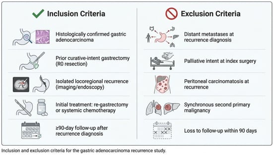 Patient selection criteria are summarized in Figure 1. Isolated locoregional recurrence was defined as recurrent disease confined to (1) the gastric remnant or anastomotic site, (2) regional lymph node stations within the D1/D2 nodal basins, or (3) local soft tissue involvement, without evidence of peritoneal dissemination or distant organ metastases on computed tomography, PET-CT (when available), or diagnostic laparoscopy. Peritoneal cytology and staging laparoscopy were performed selectively based on imaging findings and clinical suspicion. Equivocal findings were adjudicated through multidisciplinary tumor board review.