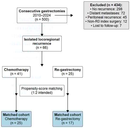 Patient flow diagram. Of 500 consecutive gastrectomies performed for gastric adenocarcinoma between 2010 and 2024, 434 patients were excluded: 298 had no recurrence, 72 developed distant metastases, 45 had peritoneal recurrence, 12 had non-R0 primary gastrectomy, and 7 were lost to follow-up. The remaining 66 patients with isolated locoregional recurrence were allocated to chemotherapy (n = 41) or salvage re-gastrectomy (n = 25). After 1:2 propensity-score matching, 42 patients (25 chemotherapy, 17 surgery) comprised the primary analysis cohort.