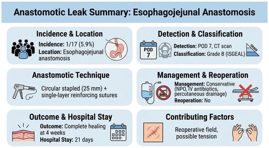 There were no 30-, 60-, or 90-day deaths in either group. Severe complications (Clavien–Dindo ≥ III) occurred in 5.9% after salvage re-gastrectomy and 16.0% after chemotherapy (p = 0.384). One patient (5.9%) in the surgical group developed a contained anastomotic leak at the esophagojejunal anastomosis on postoperative day 7, identified by a CT scan performed for fever workup. The leak was classified as Grade B per the International Study Group definition (radiologically evident, clinically manageable without reoperation). Management consisted of nil per os, broad-spectrum antibiotics (piperacillin-tazobactam), and CT-guided percutaneous drainage. The patient recovered with complete healing confirmed on water-soluble contrast study at 4 weeks, and was discharged on postoperative day 21. The anastomosis had been performed using a 25 mm circular stapler with reinforcing single-layer seromuscular sutures (3-0 absorbable). Contributing factors may have included tension at the anastomosis and the reoperative surgical field with adhesions, though no definitive cause was identified (Figure 6).