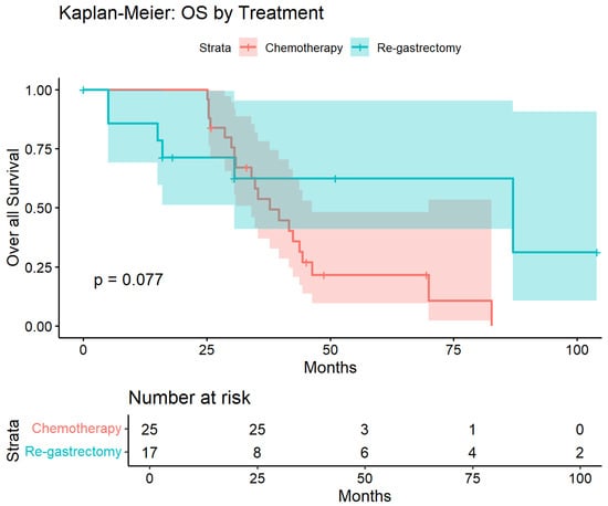 Kaplan–Meier estimates of overall survival in the propensity-matched cohort. Overall survival from recurrence diagnosis in patients treated with salvage re-gastrectomy (n = 17, blue) versus chemotherapy alone (n = 25, red). Shaded areas represent 95% confidence intervals. Log-rank p = 0.077. After multivariable adjustment, salvage re-gastrectomy was associated with significantly improved survival (HR 0.15, 95% CI 0.02–0.87, and p = 0.035). Numbers at risk are shown below.