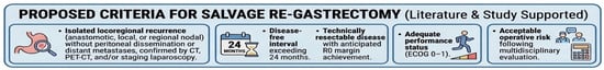 A key question that remains is which patients with locoregional recurrence after R0 resection benefit from salvage re-gastrectomy. The interval between primary surgery and recurrence may reflect tumor biology, with later recurrences suggesting a more indolent course potentially amenable to local treatment [10]. Emerging tools such as circulating tumor DNA and immune response profiling may further refine patient selection [11,12].