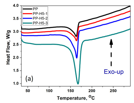 The crystallization temperature was highest (≈126 °C) for nanocomposites carrying 3 wt.% H5. Smaller-sized GNPs were observed to enhance the crystallization temperature more than the larger ones. The 3 wt.% H5-type GNPs increased the PP crystallization temperature by 11 °C, whereas at the same loading condition, only a 7 °C increase in crystallization temperature was seen for nanocomposites comprising H25 GNPs. This is obviously due to the high degree of dispersion and surface area of H5. This indicates crystallization onset occurs at higher temperatures when small-sized GNPs are filled in the PP. The degree of crystallinity of the nanocomposites was not significantly affected by both the numbers of GNPs and their sizes. The presence of GNPs in the PP matrix only promotes the formation of peculiar crystals such as the β-crystal form, and the graphene particles have little effect on PP’s degree of crystallinity [49]. This indicates that changes in the mechanical properties of the prepared nanocomposites resulted from transformation of PP’s crystal form, rather than from a change in crystallinity. The addition of GNPs did not change the melting temperature of the composites significantly. A maximum increase of about 5 °C in melting temperature was seen for 3 wt.% H5 GNPs. The small degree of variation in the melting temperature(Tm) indicates that the crystal type of PP did not change in the presence of all the grades of GNPs. Thus, Tm is only a function of PP’s crystal form.