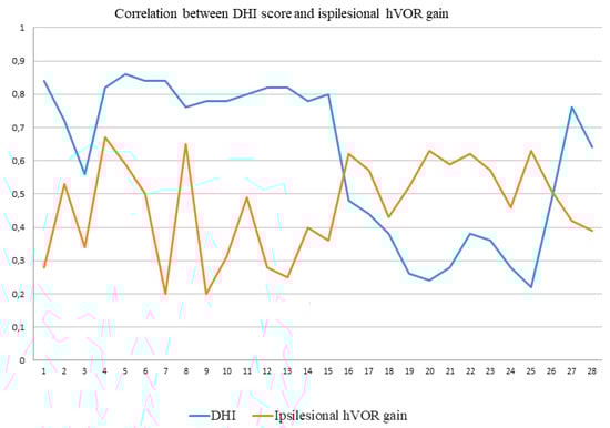 Graphical representation of the correlation between DHI scores and ipsilesional hVOR gain in the two groups. Data from 1 to 15 referred to the AVSg, data from 16 to 28 referred to the PAVSg. DHI = Dizziness Handicap Inventory; hVOR = horizontal vestibulo-ocular reflex; patient IDs are indicated on the x-axis; AVSg = Acute vestibular syndrome group; PAVSg = Post-acute vestibular syndrome group.
